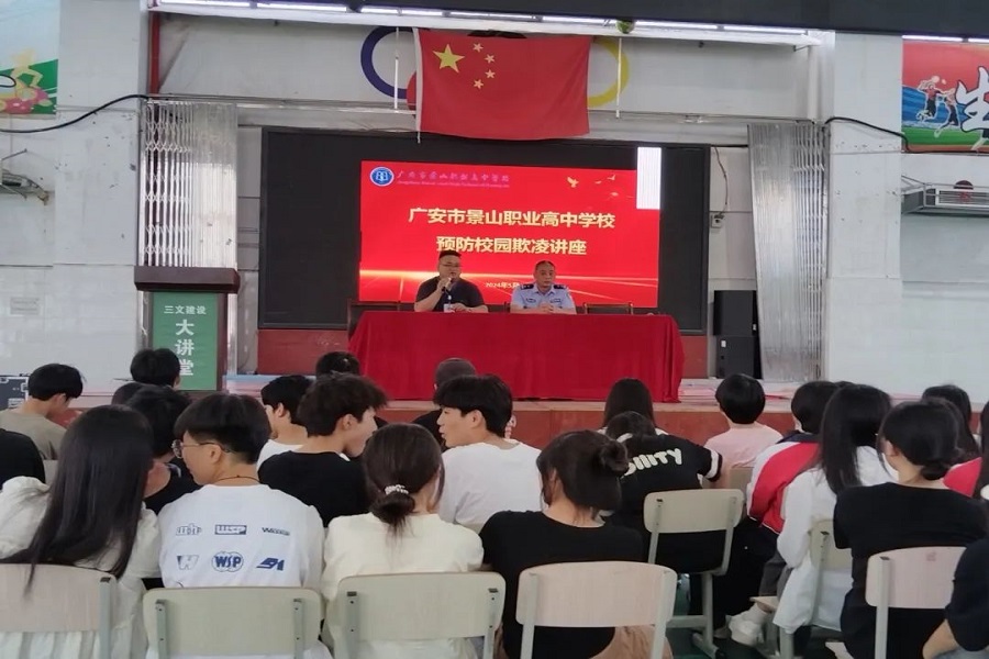在景山职业技术学校,广安区公安分局治安管理大队长、该校新聘任的法制副校长冯阳波为学生们开设了一场预防校园欺凌讲座。