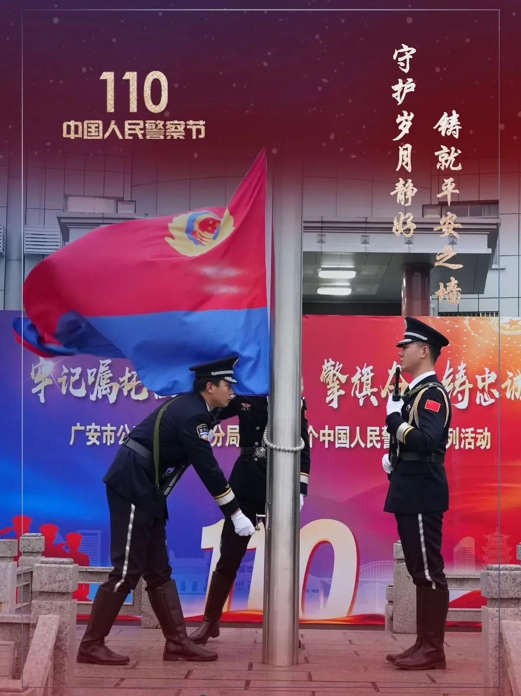 1月10日上午,广安区公安分局升警旗仪式隆重举行,随着振奋激昂的《中国人民警察警歌》旋律响起,警旗冉冉升起,全体民警、职工和辅警代表向警旗敬礼,高唱警歌。