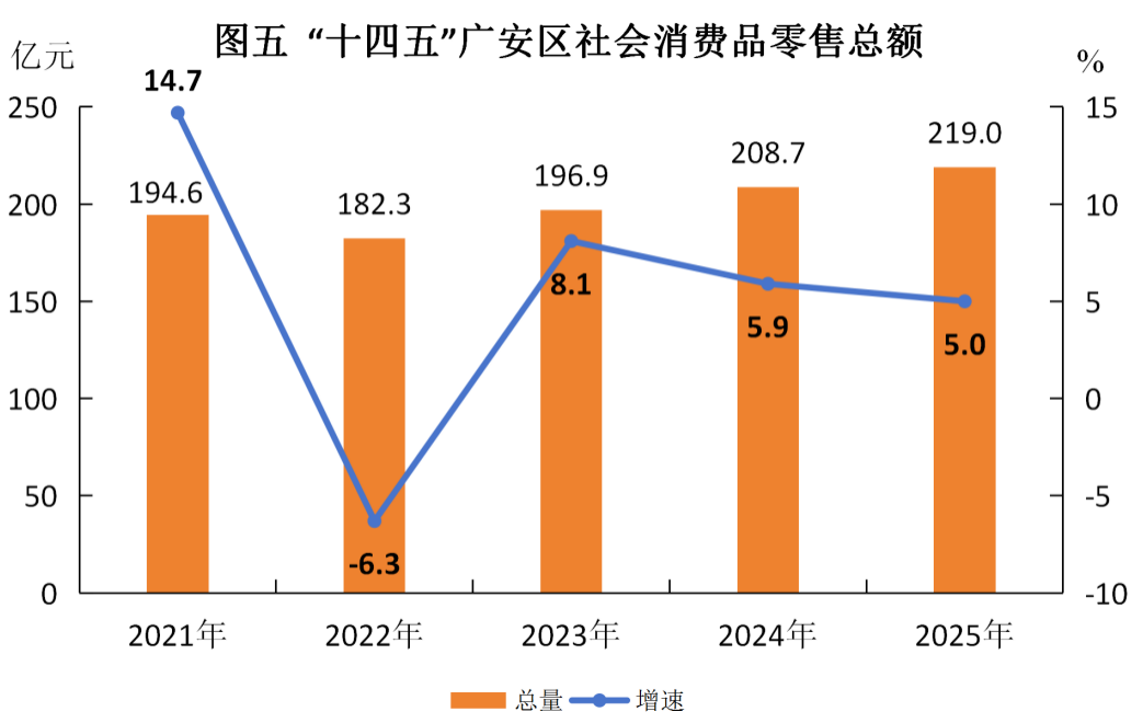 (二)消费市场繁荣活跃。2025年社会消费品零售总额219亿元,是2020年的1.3倍,规模居全市第一,“十四五”时期年均增长5.3%。“十四五”时期限额以上商贸企业数量大幅增加,由76户增加至183户。消费升级趋势明显,新能源汽车、文化及办公用品、通讯器材、绿色智能家用电器等类别成消费热点。网络零售快速发展,2025年限额以上企业(单位)通过互联网实现的商品零售额1.6亿元,是2020年的3.7倍。