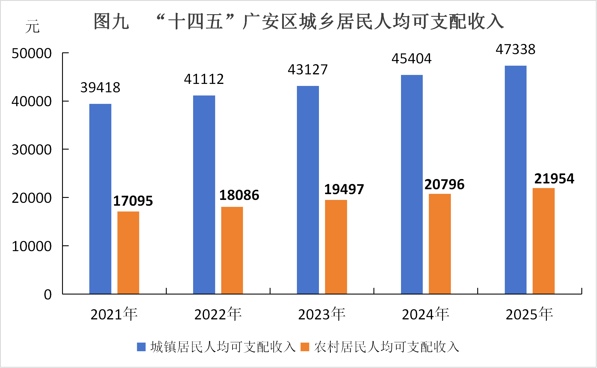 (一)居民收入稳步提高。城镇居民人均可支配收入由2020年的36330元增加到2025年的47338元,“十四五”时期年均增长5.4%;农村居民人均可支配收入由15470元增加到21954元,“十四五”时期年均增长7.3%。