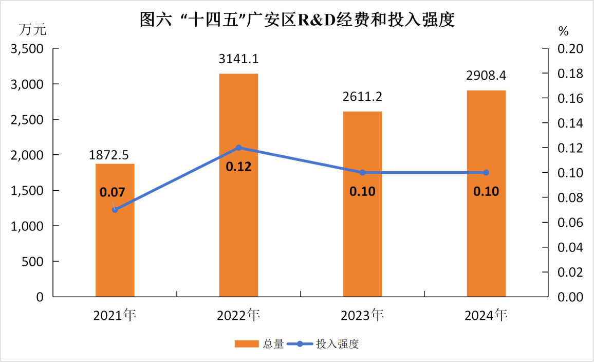 (一)科技创新步伐加快。全社会研发(R&D)经费投入持续增长,投入强度稳步提升。从2020年的2270.8万元提升至2024年的2908.4万元,年均增长5.1%,R&D经费投入强度0.1%。全区发明专利有效量达到86件;2025年技术合同成交额2.6亿元,是2020年的40.3倍。