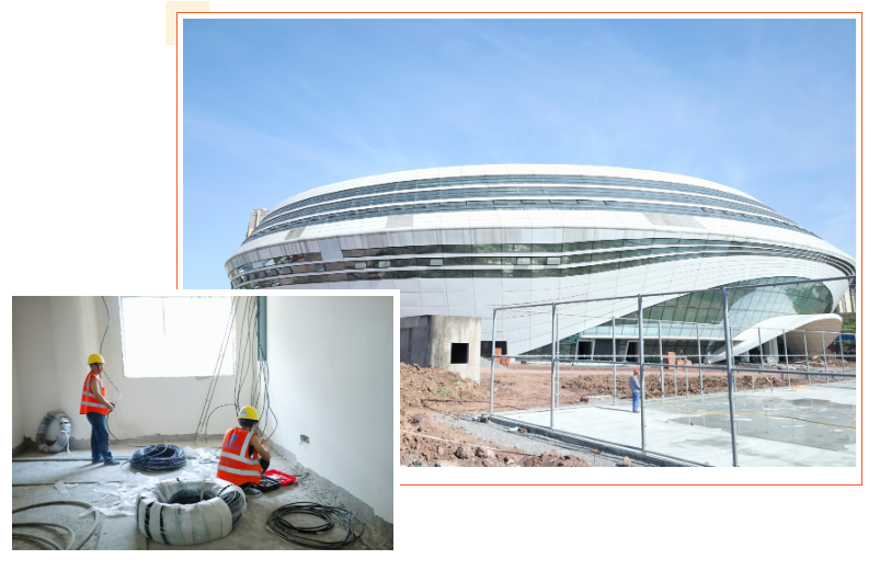 走进项目建设现场,机器轰鸣声与工人作业声交织,一派繁忙景象:室内装修工人正进行瓷砖铺贴、天棚吊顶、泳池回填、设备安装等,室外总平施工团队忙着路基铺设与绿化整地,屋顶的亮化工程也已进入收尾阶段。