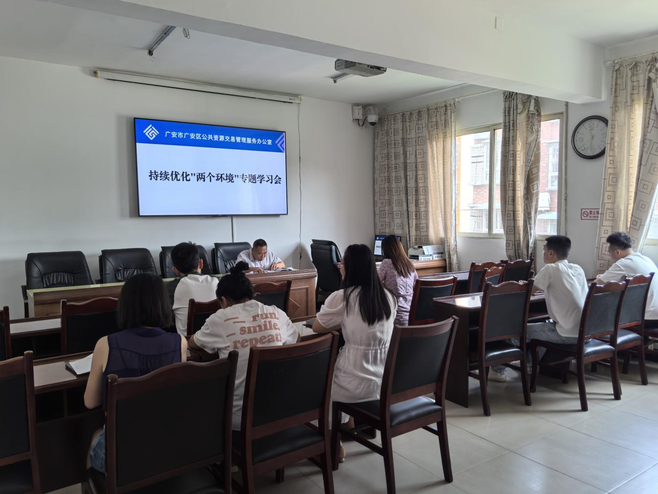 区公管办召开持续优化“两个环境”专题学习职工会会上张浩指出干部职工要提高思想认识,增强优化投资兴业环境的思想自觉、政治自觉和行动自觉,营造优化投资兴业环境良好氛围,持续推进公共资源交易高质量发展。