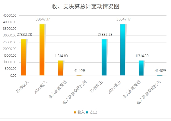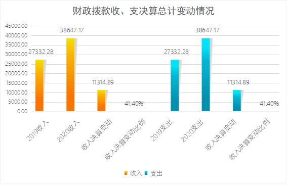 2020年单位决算收入数38647.17万元,较2019总收入27332.28万元相比增加11314.89万元,增加比率41.40%。决算支出数38647.17万元,较2019总支出27332.28万元相比增加11314.89万元,增加比率41.40%。