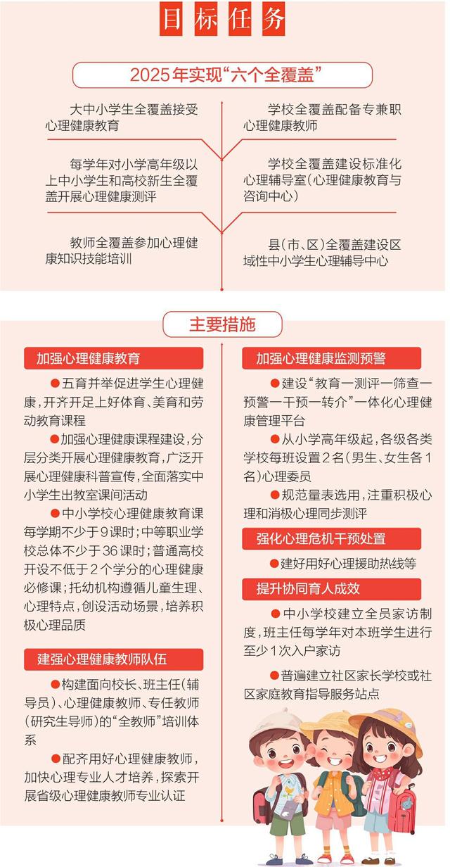 目标任务实。《实施方案》提出,到2025年,健康教育、监测预警、咨询服务、干预处置“四位一体”学生心理健康工作体系更加健全,学校、家庭、社会和相关部门协同联动的工作格局和长效机制更加完善,努力实现我省学生心理健康教育、测评“六个全覆盖”。