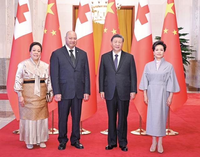 11月25日上午,国家主席习近平在北京人民大会堂会见来华进行国事访问的汤加国王图普六世。这是习近平和夫人彭丽媛同图普六世和王后娜娜茜帕乌合影。 新华社记者 燕雁 摄