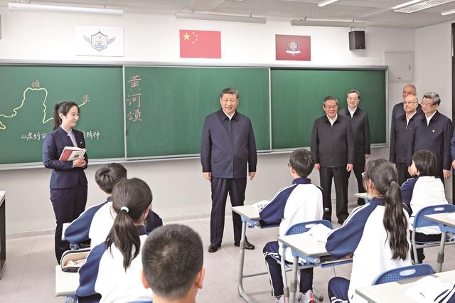 北京市援建的北京四中雄安校区2023年8月投入使用,现有学生380多人。教学楼里,学生们正在上课。习近平走进初一(2)班教室,同师生交谈,了解教学情况。他希望把北京四中办学的好经验好做法带过来,用心用情呵护孩子们身心健康,促进孩子们全面发展。