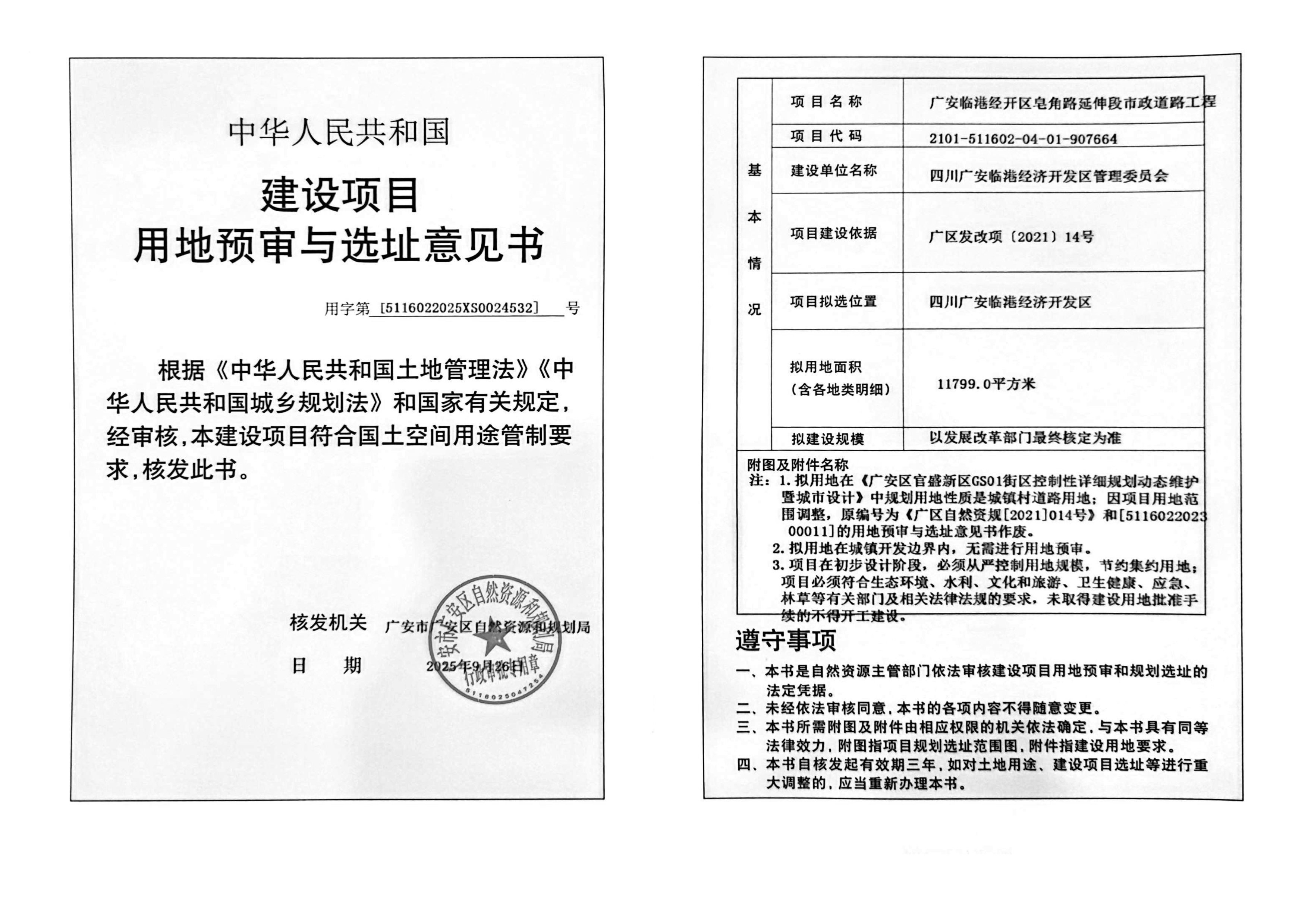 广安临港经开区皂角路延伸段市政道路工程建设项目用地预审与选址意见书