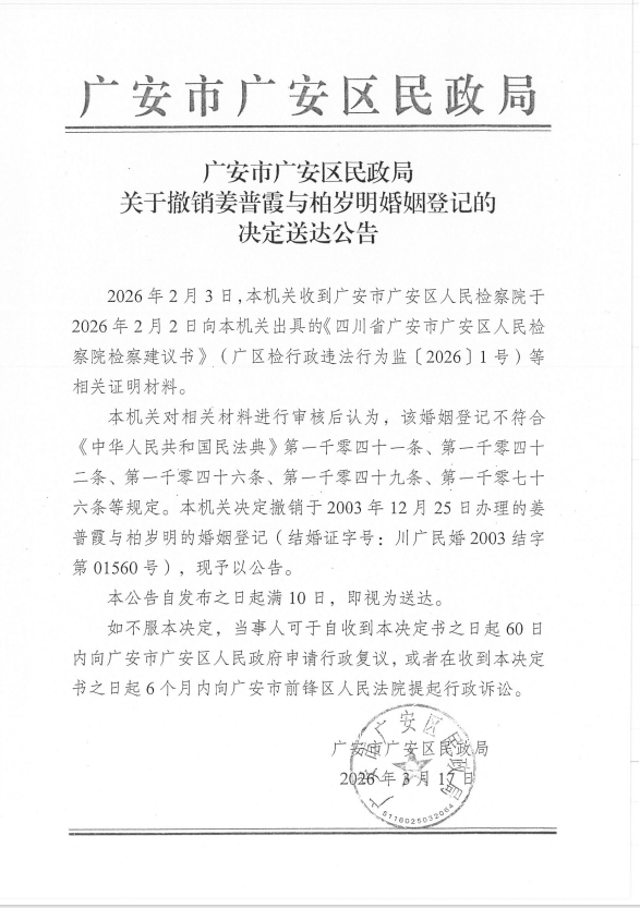 广安市广安区民政局关于撤销姜普霞与柏岁明婚姻登记的决定送达公告