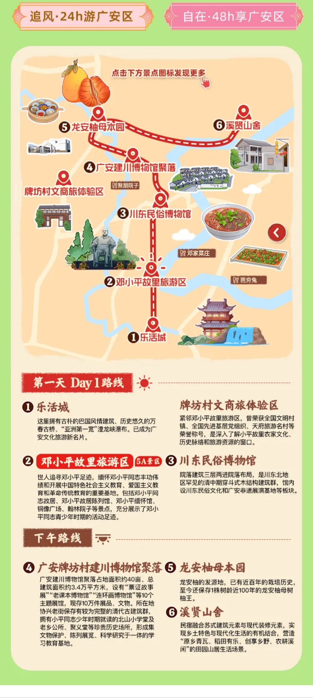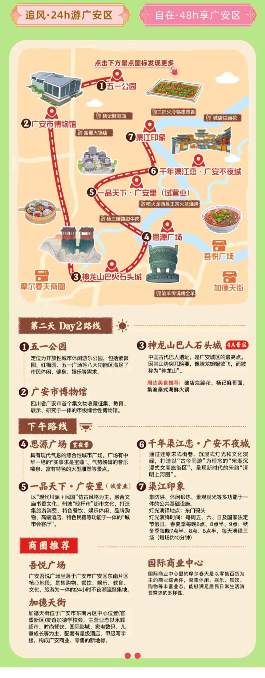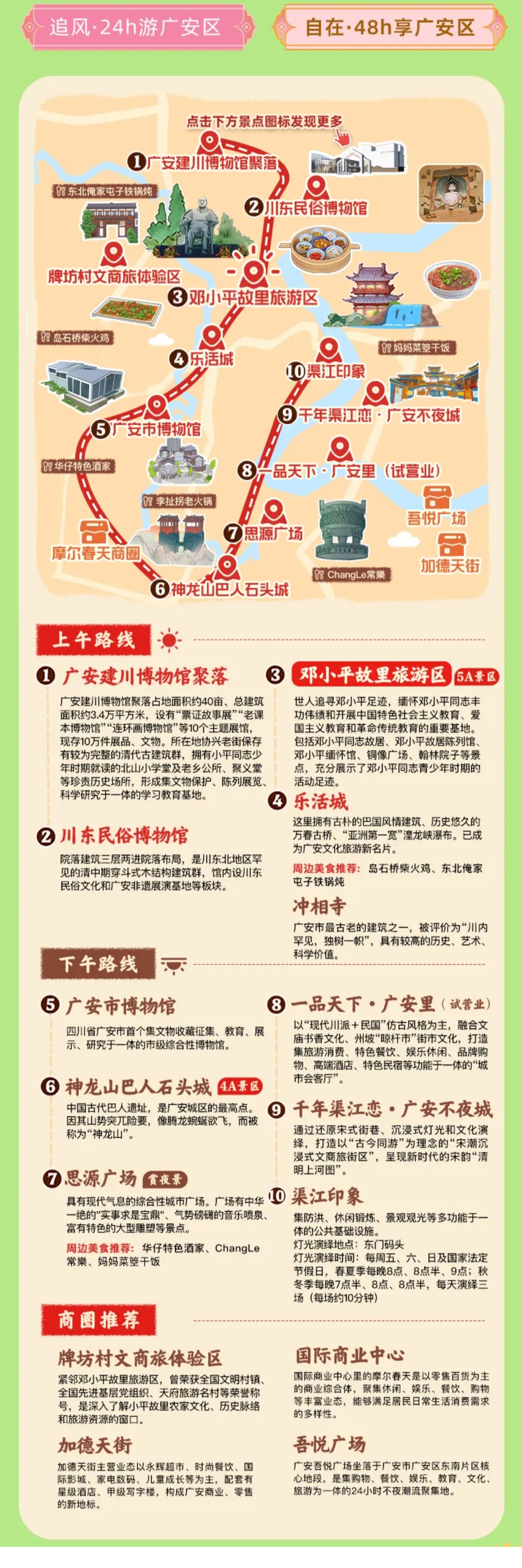 城区商圈的热度升温,是旅游美食地图串联城乡消费的生动体现。针对以往景区与商圈联动不足的问题,项目以地图为纽带,推出“追风·24小时畅游广安区”等特色线路,将邓小平故里、神龙山巴人石头城等景区与吾悦广场、加德天街等商圈无缝衔接,实现“红色旅游+都市消费”深度融合。