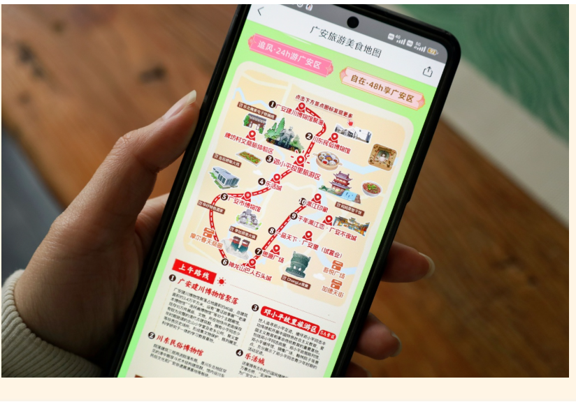 一张数字地图,入选全球减贫案例。在广安,这已成为用数字化赋能乡村振兴的生动实践。打开美团APP搜索“广安区旅游美食地图”,全国首个县级旅游美食地图跃然屏上,20余处特色景点、21道賨城美食、数十家精品民宿串联成线,将伟人故里的“食住行游购娱”资源尽数呈现。