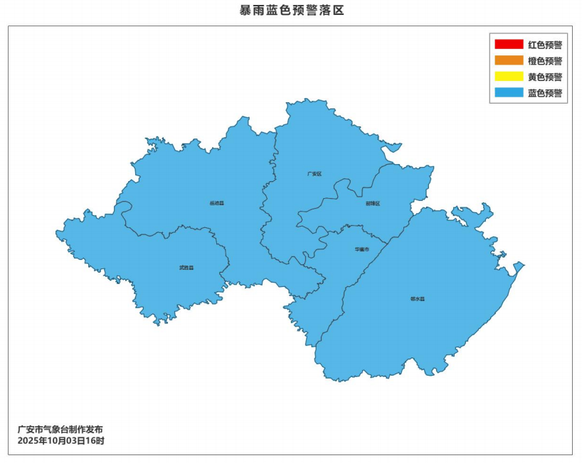 广安市气象台2025年10月03日16时31分发布暴雨蓝色预警:预计今天晚上到明天白天,我市有一次强降雨天气过程,武胜、岳池、广安区、华蓥、前锋区、邻水有大雨到暴雨(雨量30-70毫米),最大小时雨强20-40毫米,强降雨主要集中在明天凌晨到上午。过程中伴有雷电、短时强降水、阵性大风等强对流天气。